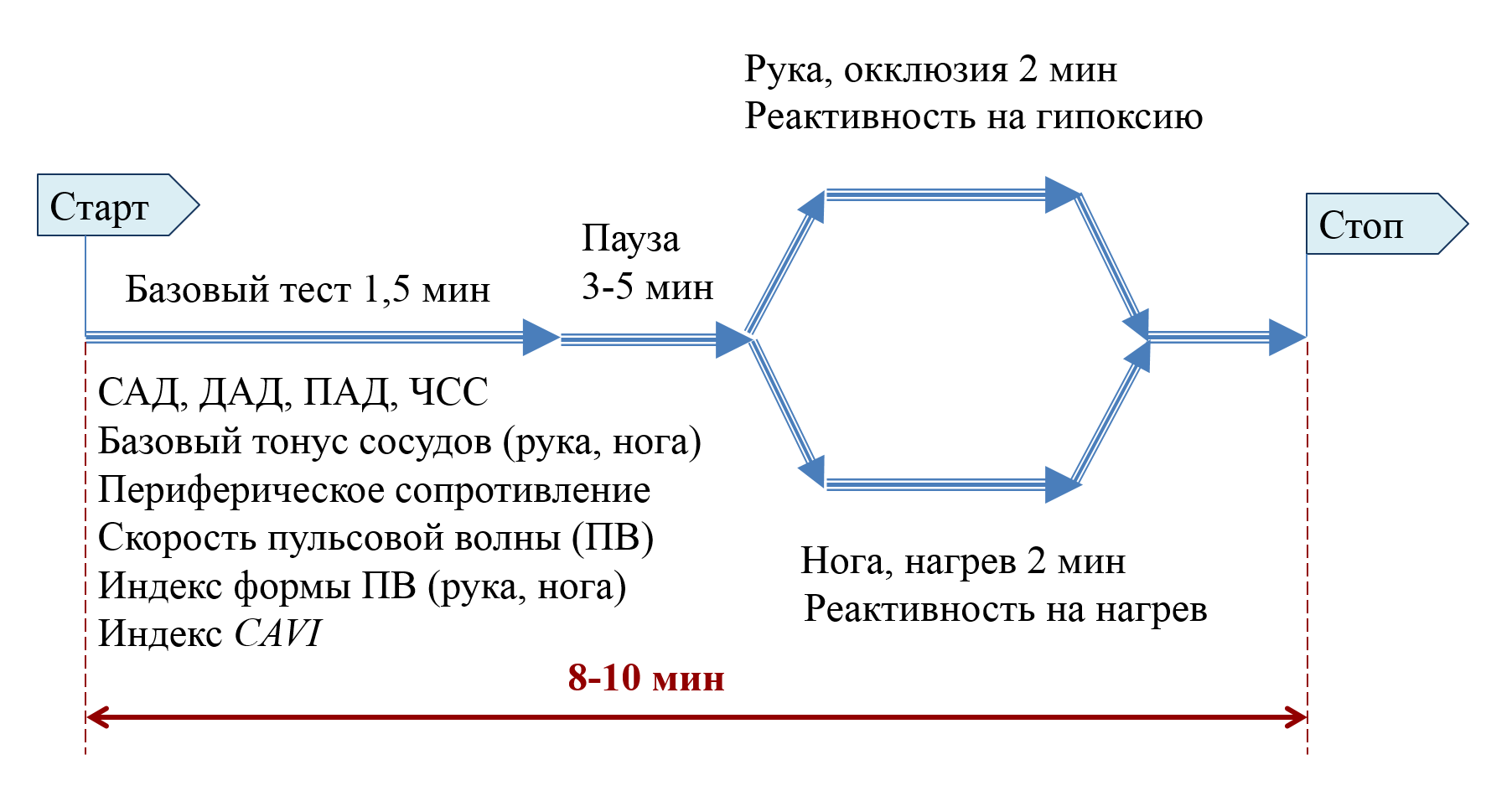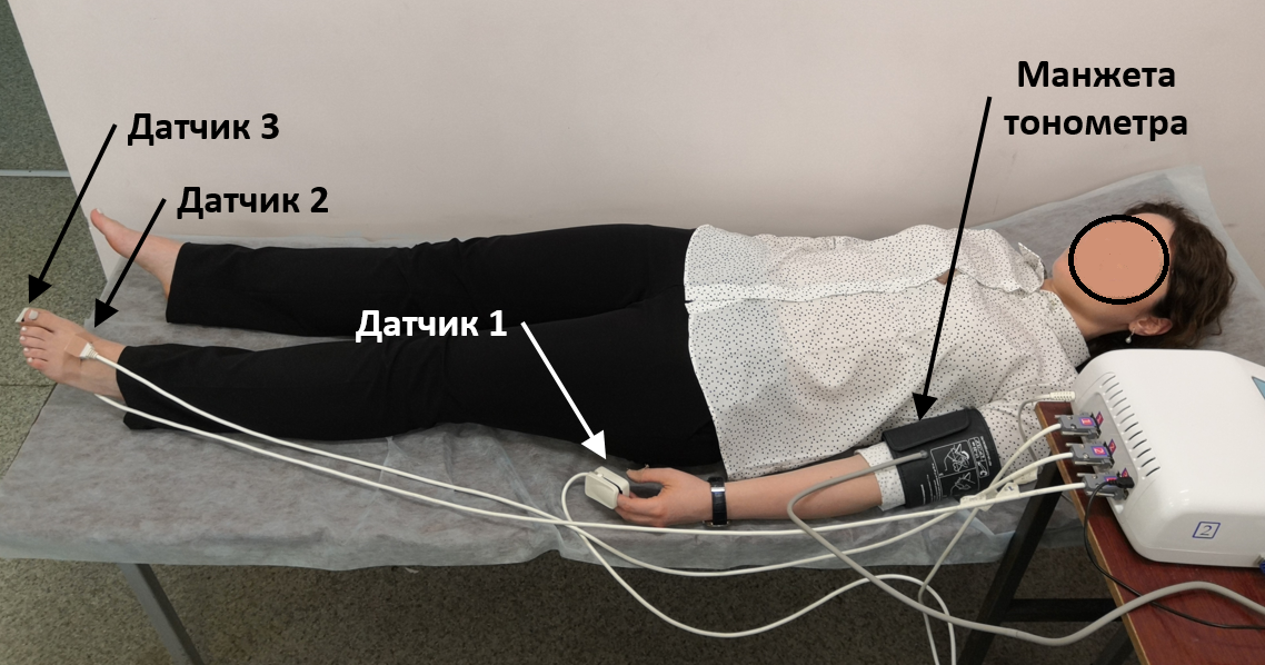 Все измерения и расчеты выполняются в автоматическом режиме с управлением от персонального компьютера (ноутбука). Пациенту в лежачем положении крепятся датчики, одеваются манжеты и нажимается кнопка «Старт». Всё остальное прибор выполняет самостоятельно. Время обследования – порядка 10 минут.