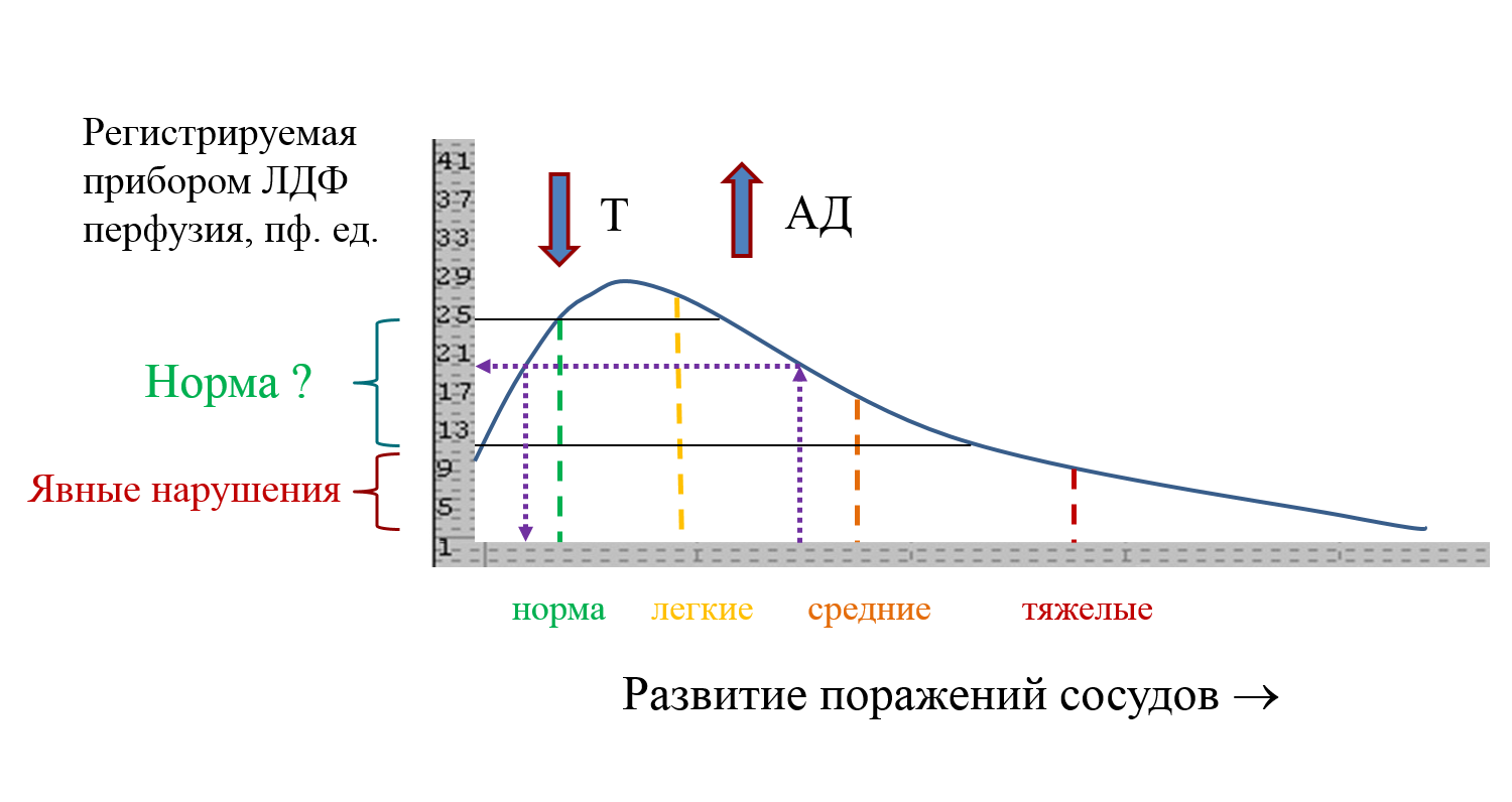 Легкие и средние поражения, ишемии, компенсируются сначала ослаблением тонуса (T) сосудов и возрастанием перфузии, т.е. возрастанием кровотока, а затем, при недостаточной компенсации и продолжающемся развитии осложнений, т.е. при исчерпании возможности компенсации нехватки кислорода и других веществ за счет снижения тонуса, - еще и повышением артериального давления (АД). Это работа адаптационного компенсаторного механизма для поддержания кровообращения на достаточном уровне в условиях поражений сосудов и развития ишемии и гипоксии. Только после этого и при остающейся гипоксии и недостаточной ее компенсации за счет увеличения АД, наступают уже необратимые поражения (не компенсируемые), приводящие явно к снижению регистрируемой перфузии, главным образом за счет поражений крупных артерий. Таким образом, в большом интервале регистрируемой перфузии (по оси ординат), пока не наступят некомпенсируемые поражения, нельзя достоверно сказать, регистрируется перфузия в норме или уже при развитии заболевания. Аналогично ведут себя и параметры, измеряемые в ФПГ, РВГ и другими подобными методами. Этим объясняется недостаточная чувствительность перечисленных выше отдельных методов диагностики к выявлению ранних сосудистых нарушений при СД. Данные по группам испытуемых сильно перекрываются, и индивидуальное диагностическое заключение о наличии поражения сосудов становится возможным только уже в ситуации тяжелых сосудистых патологий, когда, собственно, такая скрининговая диагностика уже теряет всякий смысл - и так всё очевидно.